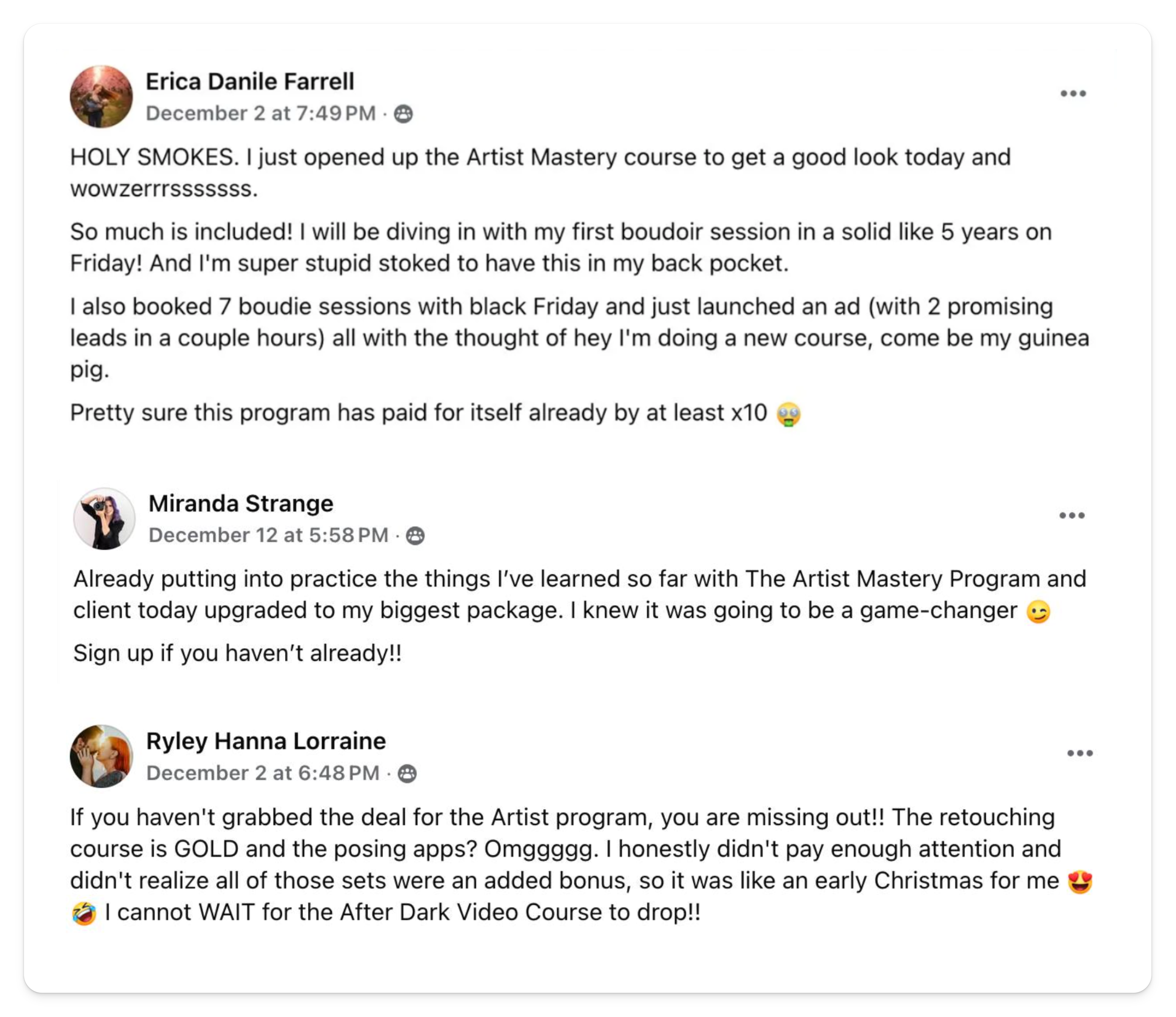 The ARTIST Mastery Program exists because I've seen too many talented photographers struggle to create consistently stunning work. They're relying on good angles and good luck, hoping every session will turn out Instagram-worthy.