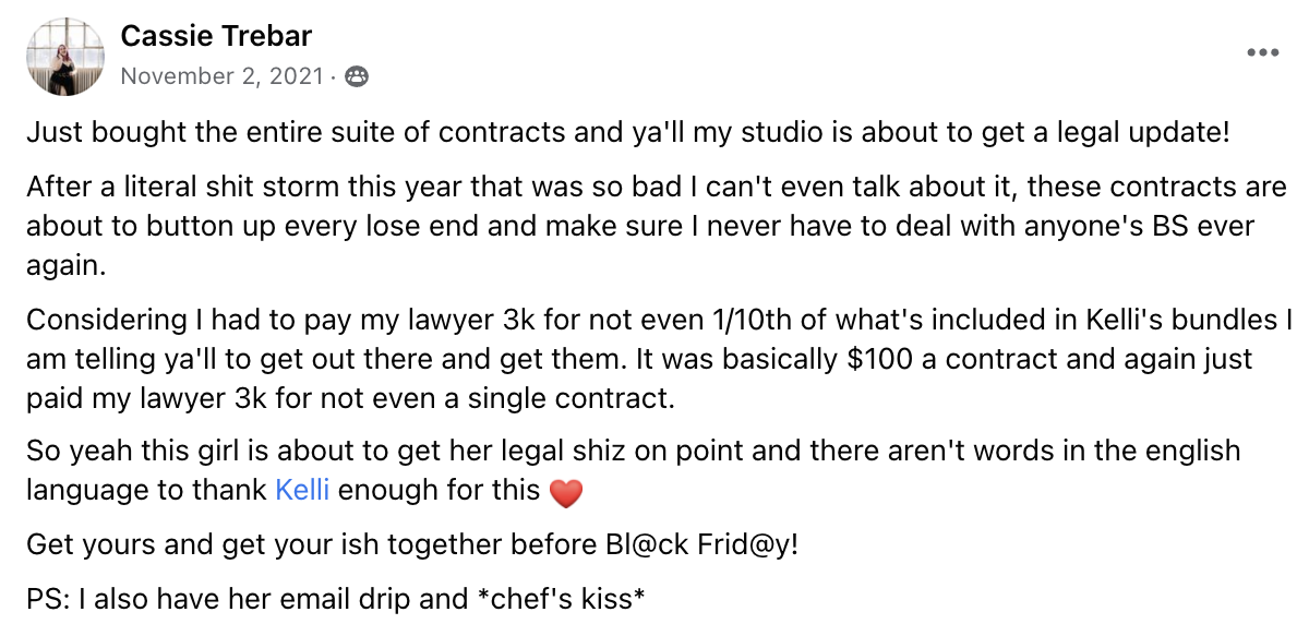 This Session Contract Bundle will keep everything tidy, legal and transparent. Individual contracts are $150 or more each, so this is a great way to get the set and save some cash.