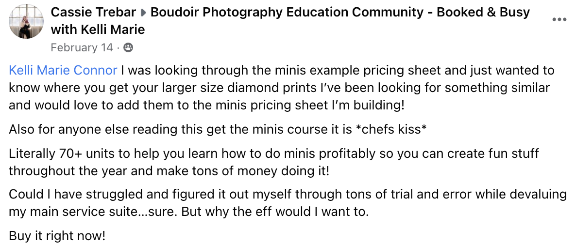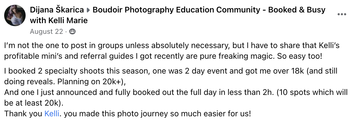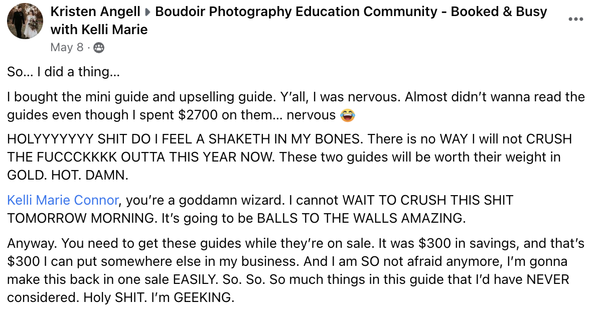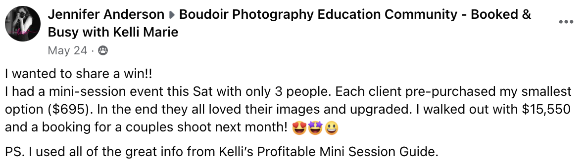 This course is applicable to all levels of photographers, whether you’re new to the business and trying to get clients in the door or you’re established and want to run something different and fun! This is even great for super successful studios who are looking to bring in MORE money in LESS time! Seriously, anyone can use the principles in this guide to revolutionize the way business is done.