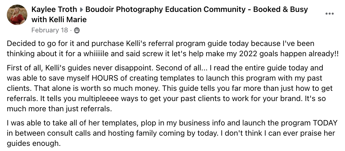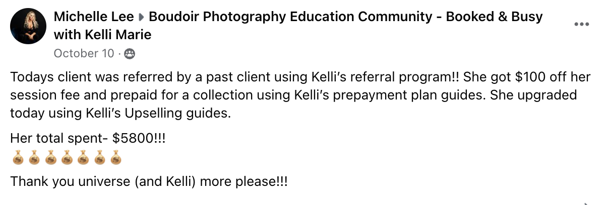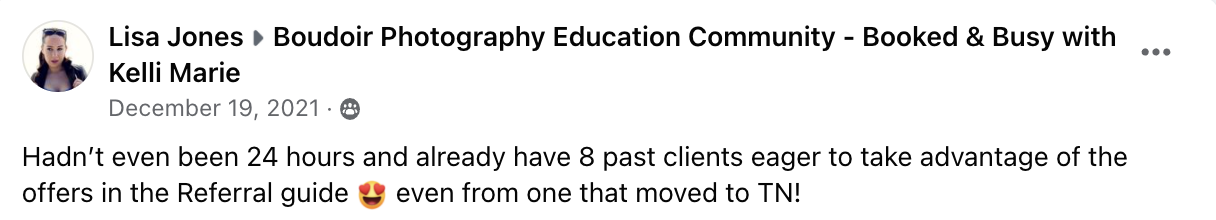 In addition to my Referral Program, I have also added lots of information about how/why to run a Past Client Facebook Group, as this can be a great tool to keep your past clients engaged, booking, and referring. You can leverage this group to stay in contact with past clients specifically, this group does not need the time and attention as your main Facebook group but will be an excellent tool in your toolbox. Lots of genius ideas in there for client retention keeping your past clients working for you!