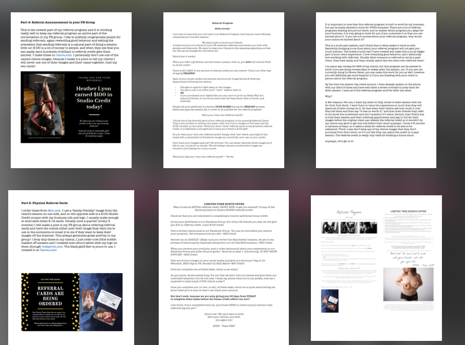 Includes tips and instructions on how to use, email templates, screenshots of referral program forms, and overview of referral program cards and bonuses.